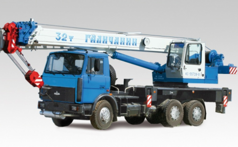 Кран стреловой автомобильный КС-55729В грузоподъемностью 32 тонны смонтирован на шасси автомобиля МАЗ-630303.